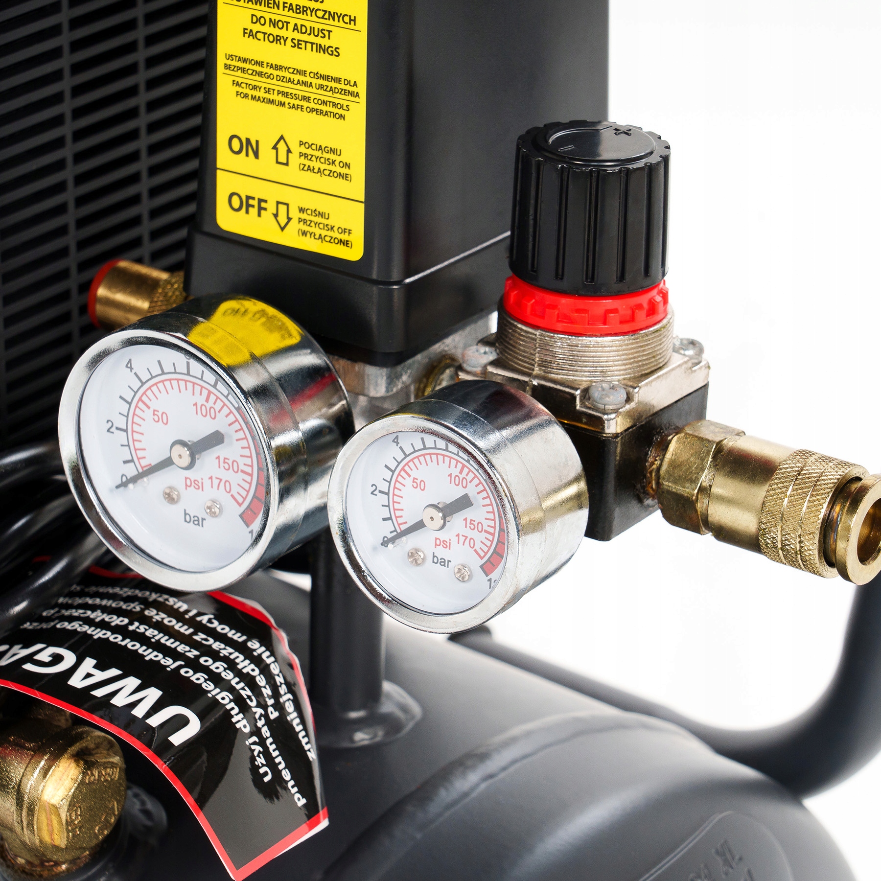 Ciśnienie maksymalne kompresora to 8 bar. Reduktor ciśnienia posiada precyzyjny mechanizm regulacji.