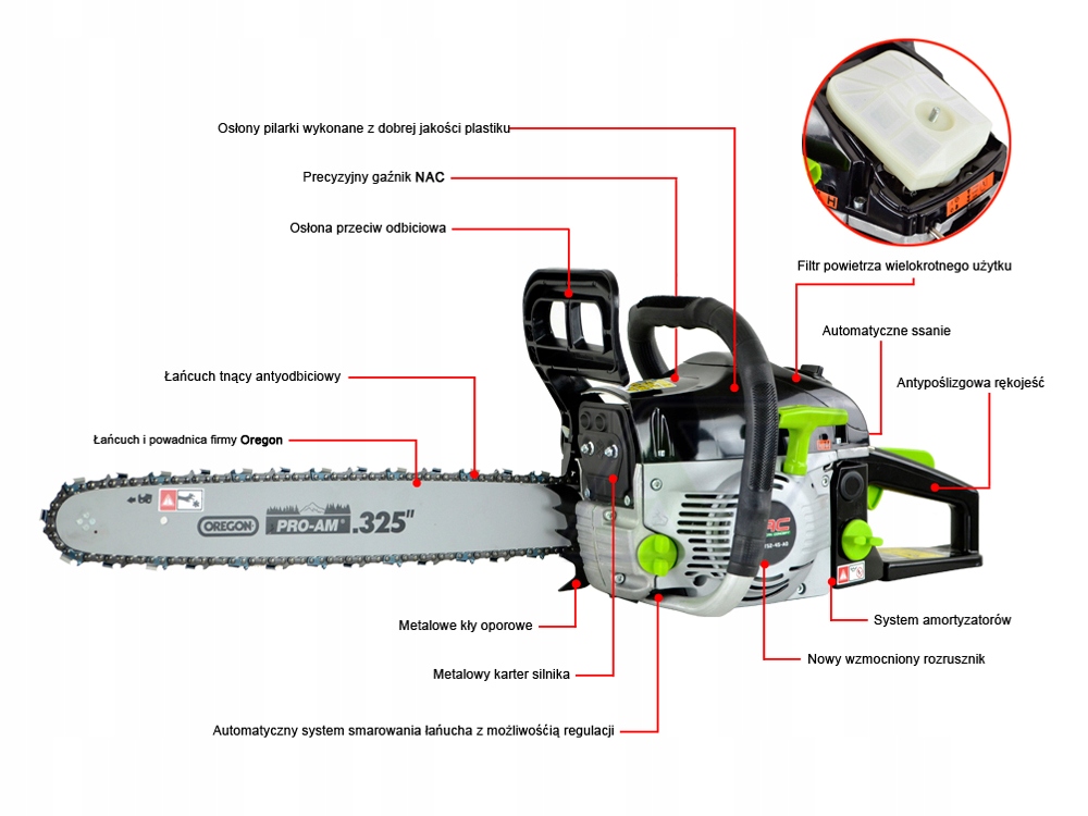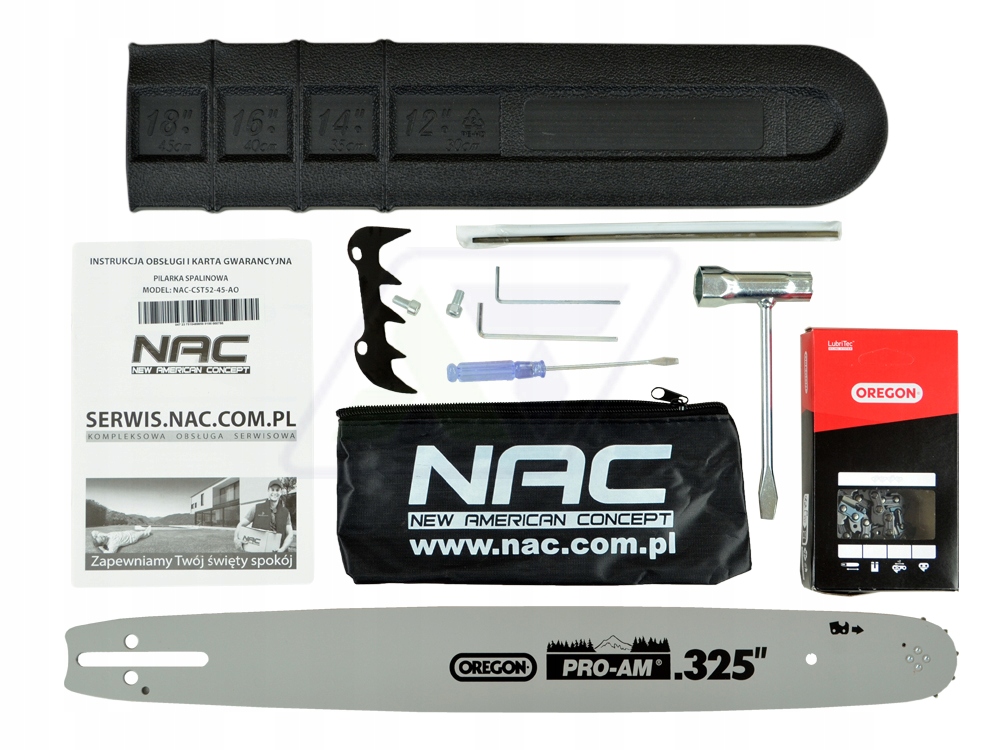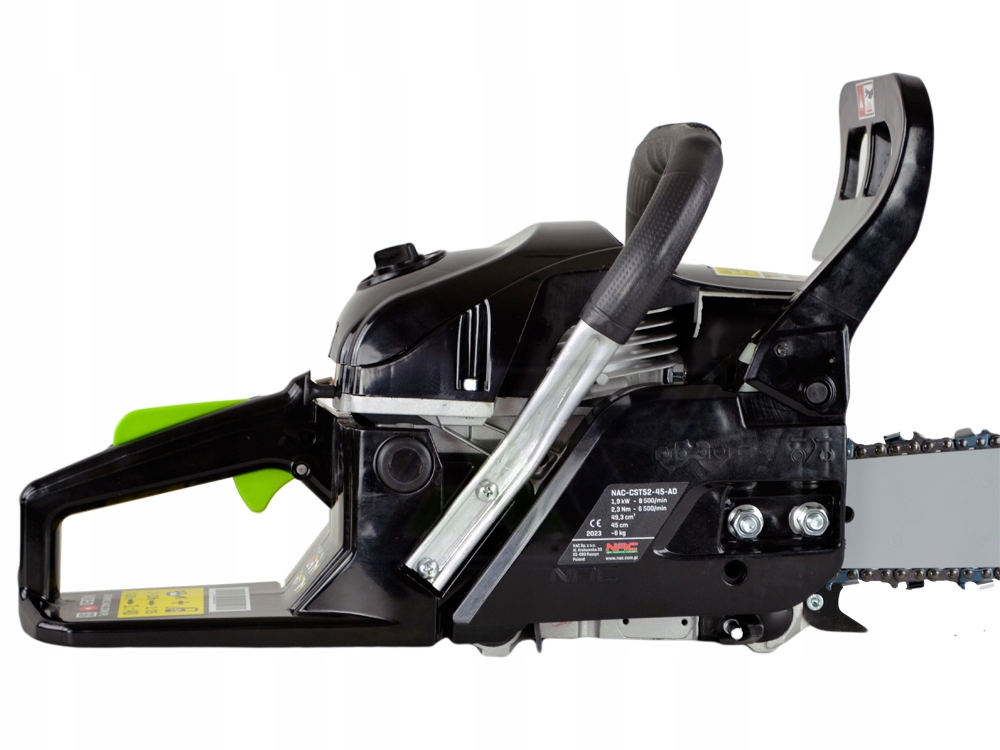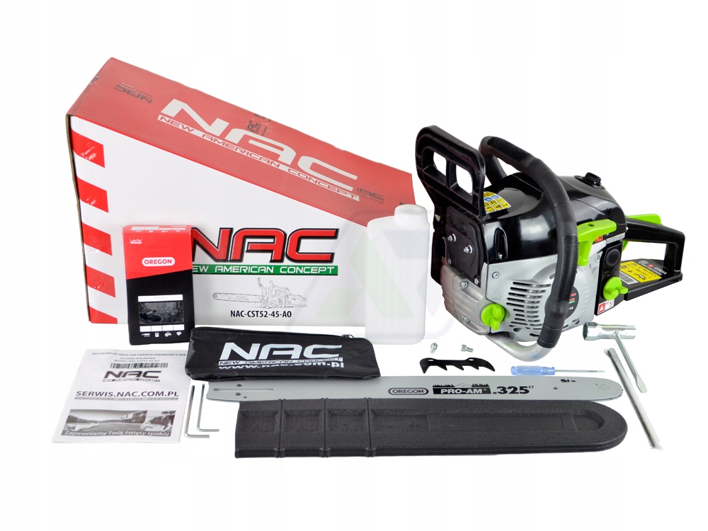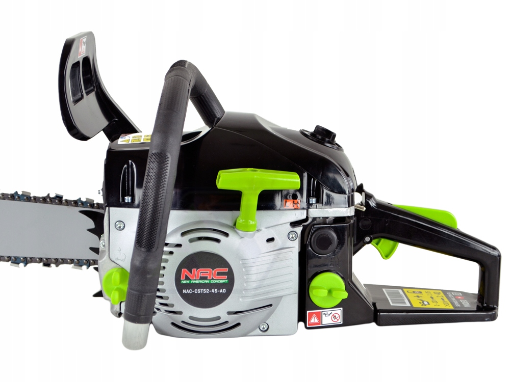 Wysokiej jakości pilarka spalinowa NAC-CST52-45AO z maksymalną mocą silnika 3 KM. Wyposażono ją w prowadnicę o długości 45 cm i wysokiej jakości system tnący marki Oregon.