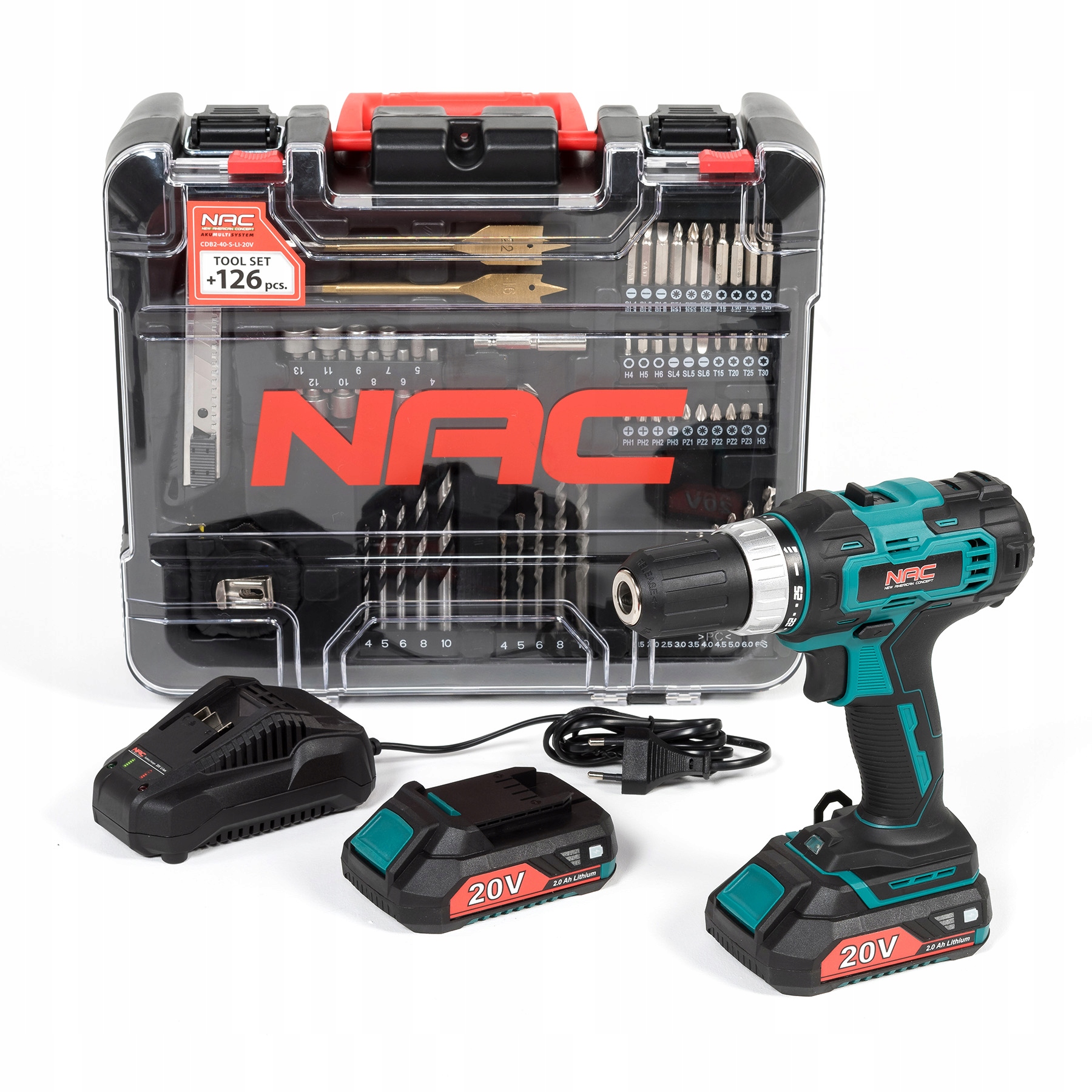 Zestaw akumulatorowa wkrętarka NAC CDB2-40-S-LI-20V to wiertarko-wkrętarka akumulatorowa z dwoma bateriami 2Ah, ładowarką i walizką, należąca do linii NAC AKUMULTISYSTEM 20V. Narzędzie oferuje maksymalny moment obrotowy 40 Nm, 2 biegi oraz możliwość zmiany kierunku obrotów lewo/prawo. Płynna regulacja prędkości (0-400 obr./min na pierwszym biegu, 0-1500 obr./min na drugim) i 25-stopniowa regulacja siły wkręcania pozwalają dostosować pracę do materiału. Samozaciskowy uchwyt umożliwia montaż wierteł i bitów do 13 mm bez dodatkowych narzędzi. Wbudowane LED, wskaźnik naładowania oraz magnes na obudowie zwiększają wygodę pracy. Ergonomiczny uchwyt antypoślizgowy gwarantuje pewny chwyt, a poręczna walizka pozwala na przechowywanie akumulatorów, ładowarki i akcesoriów niezbędnych do wkręcania i wiercenia.
