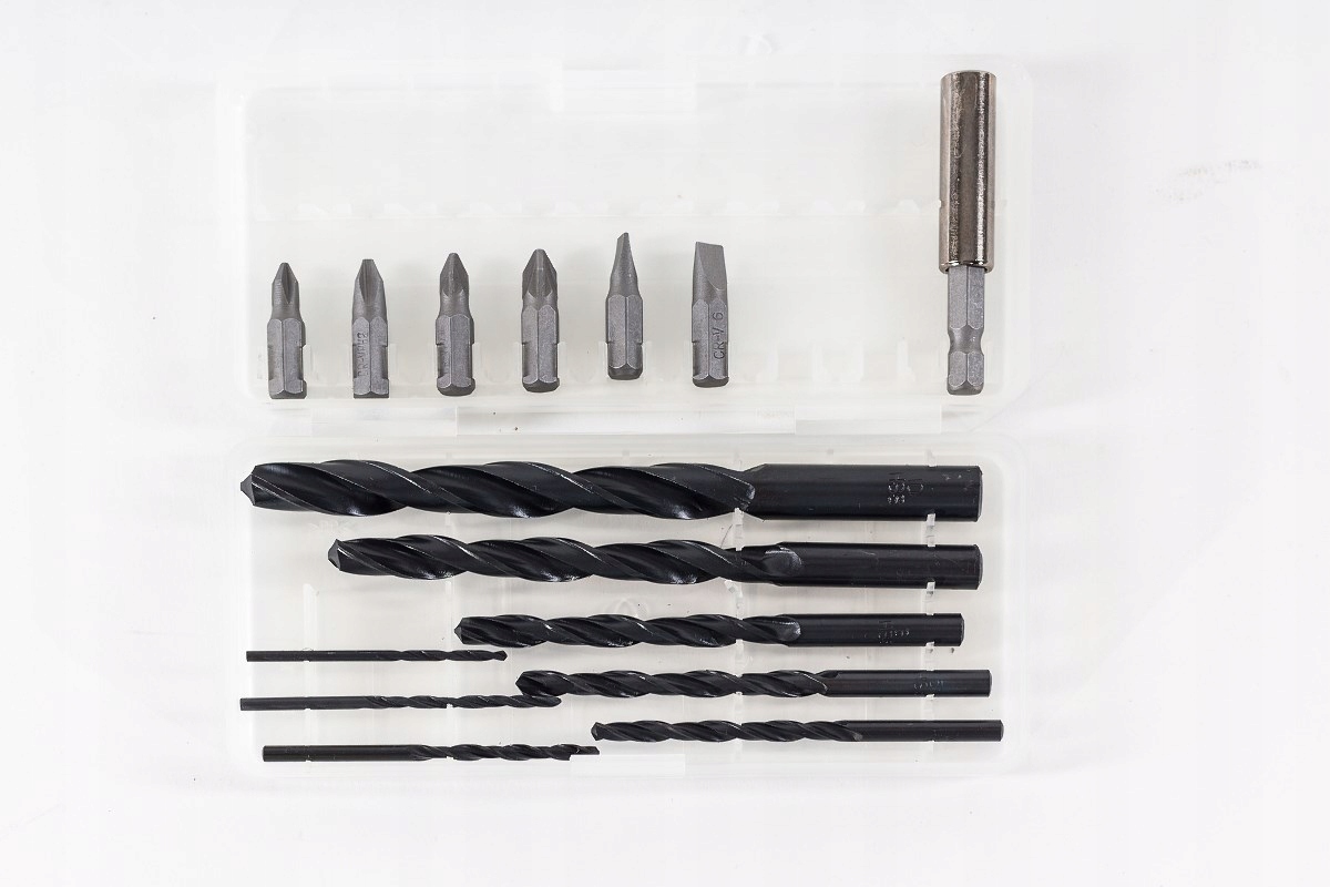 w zestawie z 2 akumulatorami, szybką ładowarką, walizką oraz wiertłami i bitami