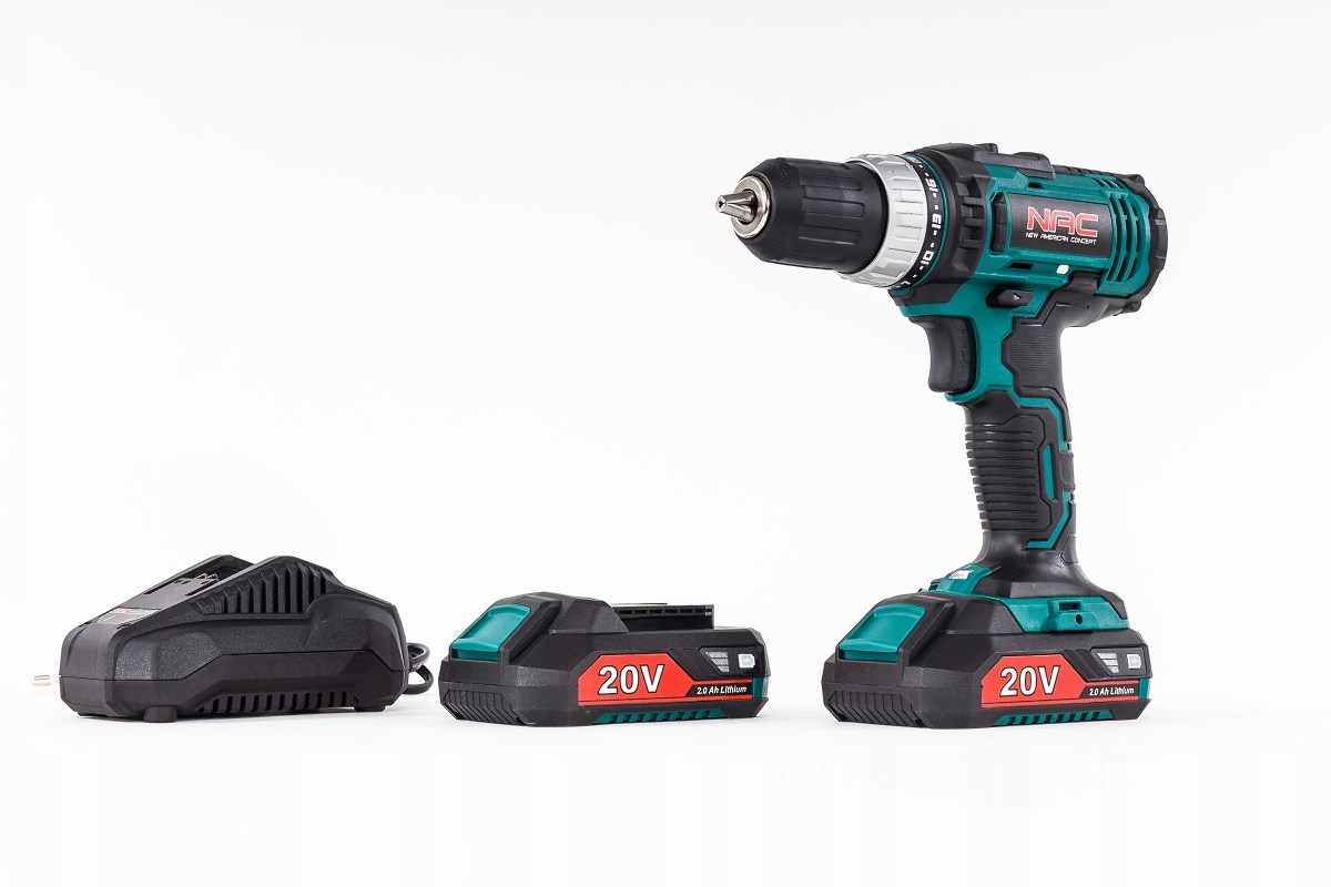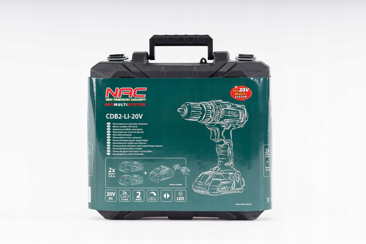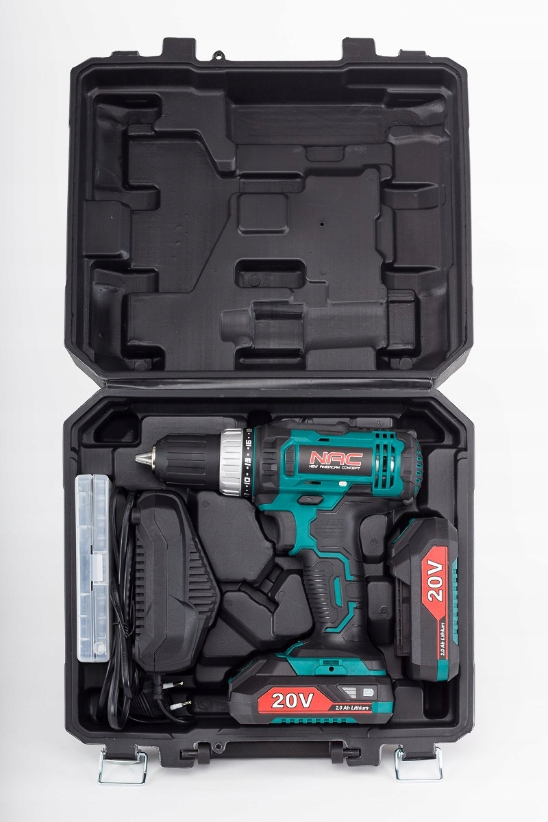 Wiertarko-wkrętarka NAC CDB2-LI-20V posiada poręczną walizkę wykonaną z tworzywa, w której mieszczą się 2 akumulatory o pojemności 2 Ah, szybka ładowarka sieciowa, sześć końcówek do wkręcania z uchwytem oraz 8 wierteł.