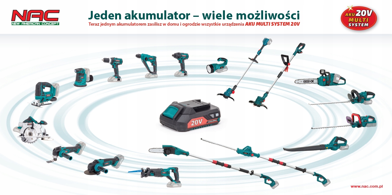 Urządzenie z linii NAC AKUMULTISYSTEM 20V: to linia narzędzi akumulatorowych NAC, które zasilane są tą samą baterią.