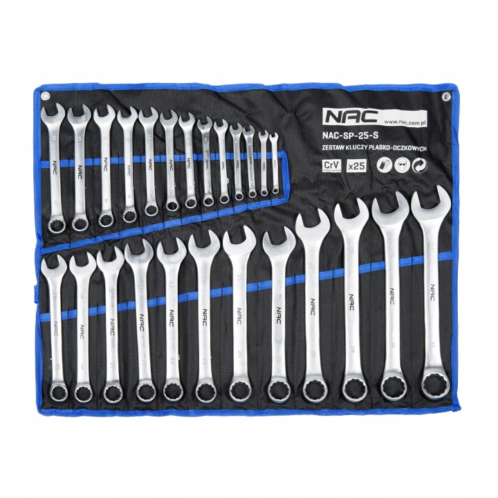 Zestaw kluczy płasko-oczkowych NAC składa się z 25 kluczy. Różnorodność rozmiarów w zestawie pozwala dopasować klucz do swoich potrzeb oraz wykonywania różnych zadań.